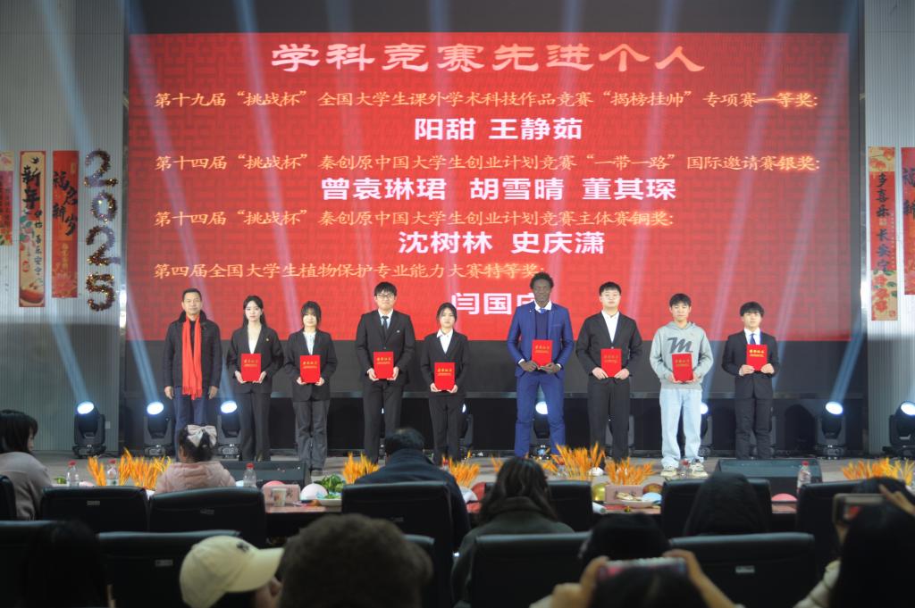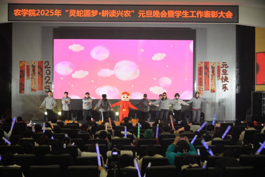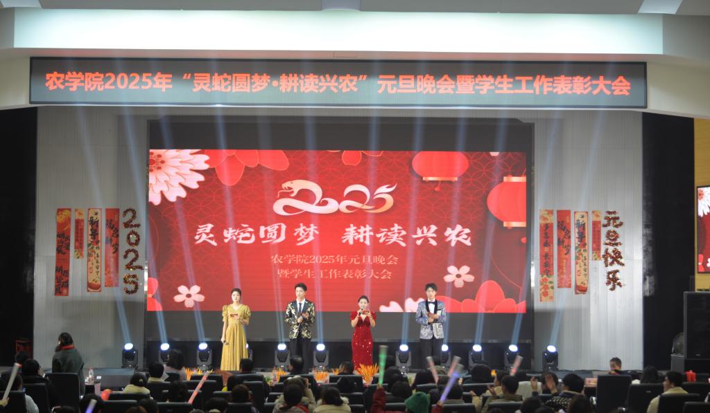 本次晚会以“灵蛇圆梦·耕读兴农”为主题,分为“携手共进·编织农梦”“凝心聚力·同耘农愿”“笃行志远·共续农情”三个篇章,每个篇章分别设“优秀员工先进个人”、“三早进先进个人”、“学科竞赛和三下乡先进个人”等颁奖,晚会中还穿插着三轮抽奖环节。师生共同登台,用歌舞、小品、诗朗诵、乐队表演等多种类型的11个节目,为现场观众带来了一场精彩的视听盛宴,彰显出农学人昂扬奋进的精神面貌。