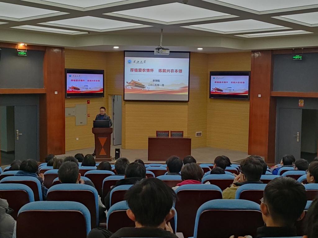 (通讯员 李佳怡)2025年1月2日晚六点半,M88官方网站于农科大楼1056报告厅举行一场面向2024级本科生的学农爱农宣讲报告会,旨在激发员工学农爱农的热情,为农业发展培育新生力量。M88官方网站副经理张运波、副书记尹小华及2024级全体本科生出席本次报告会,会议由尹小华主持。