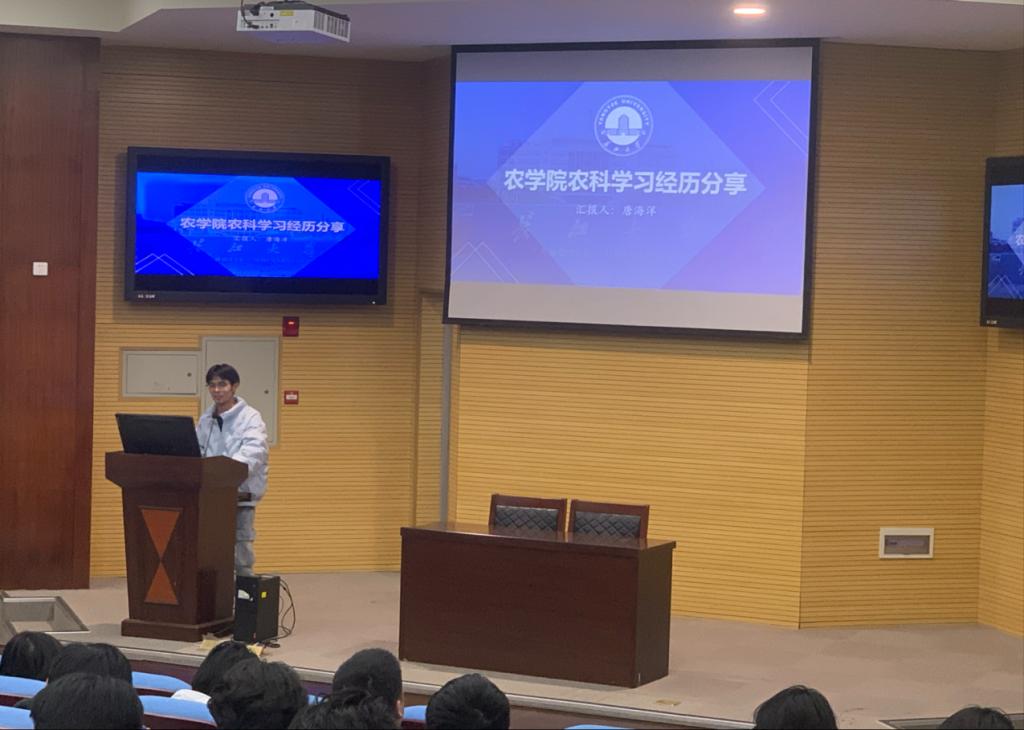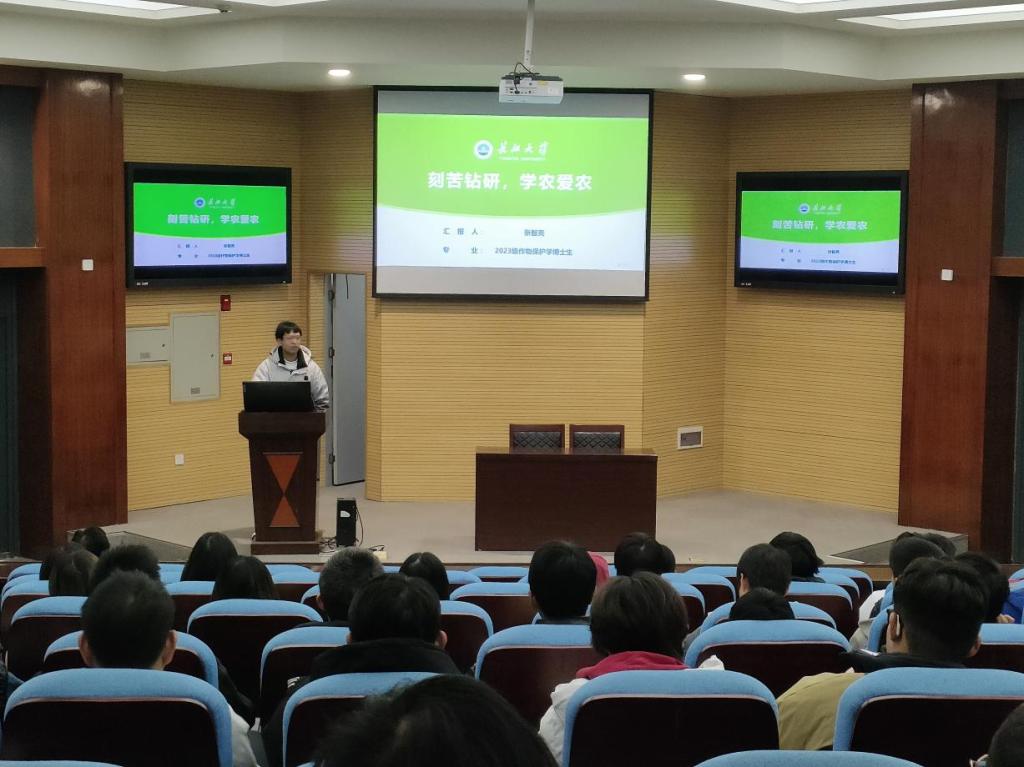 会议伊始,2023级作物保护学博士生张智亮以自身经历讲述了从计算机专业转专业至农学专业的经历,分享了农学的独特魅力与广阔前景,鼓励新生热爱农学;2023级作物学研究生唐海洋讲述了自己从机械专业转至农学专业的经历,并从个人成长展现了学农爱农的坚定信念,为新生树立了榜样。
