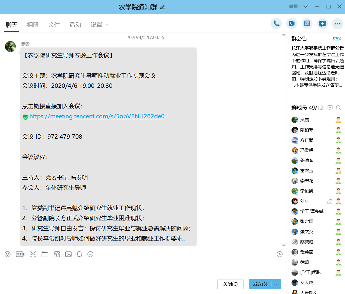 通讯社讯(通讯员 吴霞 刘庆)为进一步做好2020届研究生就业工作,扎实推进研究生毕业生顺利毕业和成功就业,4月6日19:00,M88官方网站利用“腾讯会议”平台召开研究生导师推动就业工作专题会议。公司经理李俊凯、党委书记冯发明、副经理张文英、副经理方正武、党委副书记谭亮魁、全体研究生导师、各个科室负责人及全体辅导员共55人参加会议。会议由公司党委书记冯发明主持。