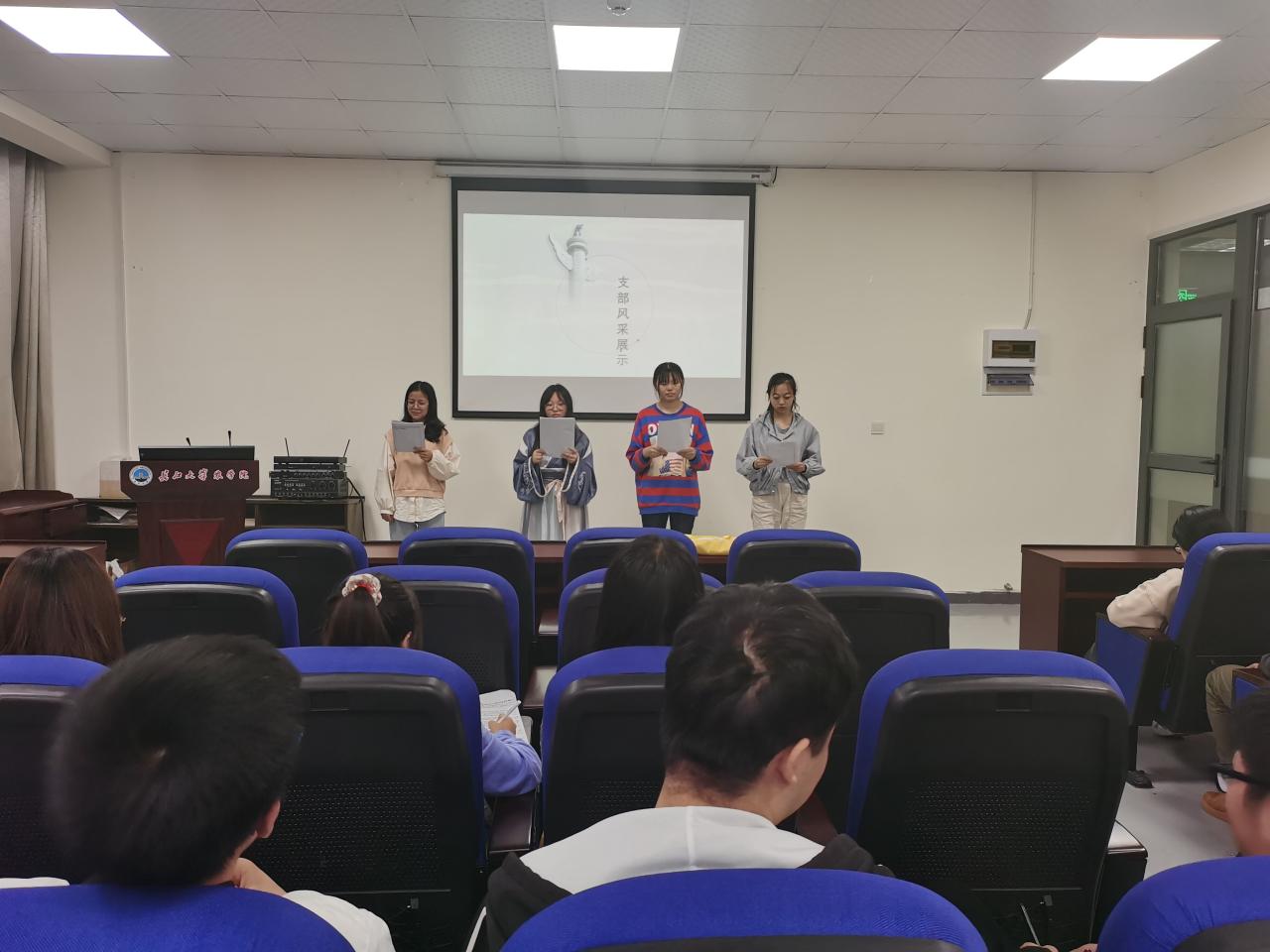 此外,农资31801班还开展了“百生讲坛”活力团支部建设主题班会。会上,主持人邹宇傲主要从班级概况、学习创新、学习成果介绍三个方面向同学们展开讲述。他首先从班训和班歌方面阐述了本班的支部文化。随后,他以班级平均绩点、课程通过率、四六级通过率为切入点,提醒同学们要向身边优秀的同学看齐,并努力提升自己。最后,他表示本班支部尤其注重学习工程,按公司公司的要求,每月都会进行相关材料的集中学习。今后支部也将积极开展理想信念、社会主义核心价值观主题宣传教育活动,认真学习贯彻习近平新时代中国特色社会主义思想和党的十九大精神,并引导团员员工增强“四个意识”,坚定“四个自信”,坚决做到“两个维护”。