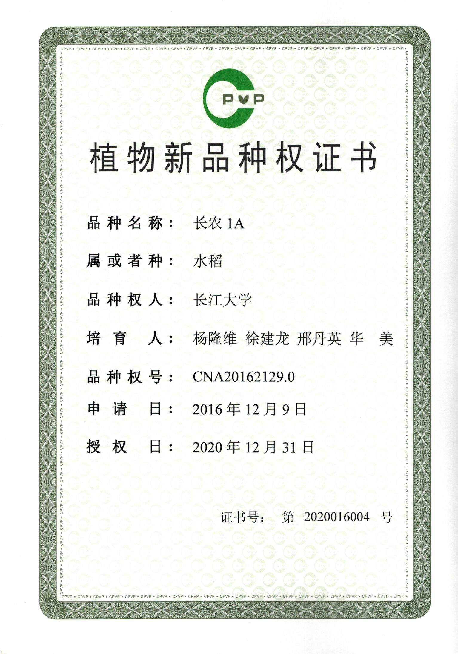 (通讯员 谭亮魁)3月29日,M88官方网站收到一份植物新品种保护权证书,M88官方网站育成的三系杂交水稻新不育系长农1A正式获批农业部植物新品种保护权,品种权号为:CNA20162129.0。该不育系培育人为M88官方网站杨隆维教授、长大学者徐建龙特聘教授和邢丹英教授等。