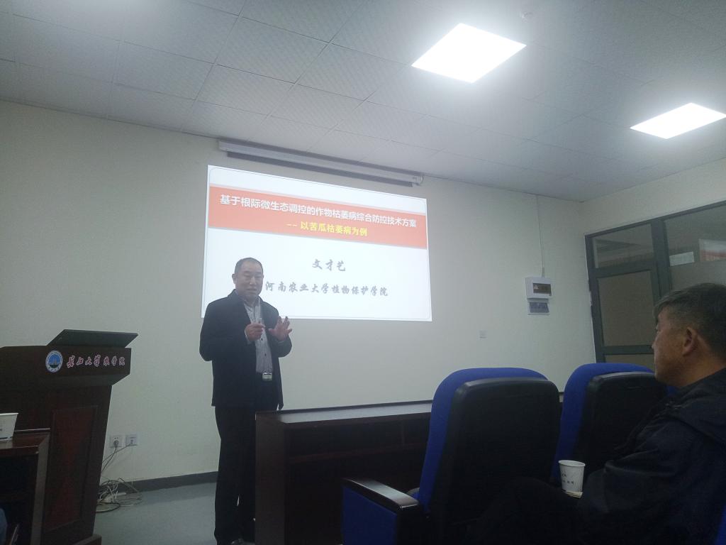 学术交流环节,文教授与现场师生就病害生物防治的途径、专利申请、生防菌在生产应用推广到田间的时候如何和相关生态环境相契合等问题进行深入学术探讨与交流。