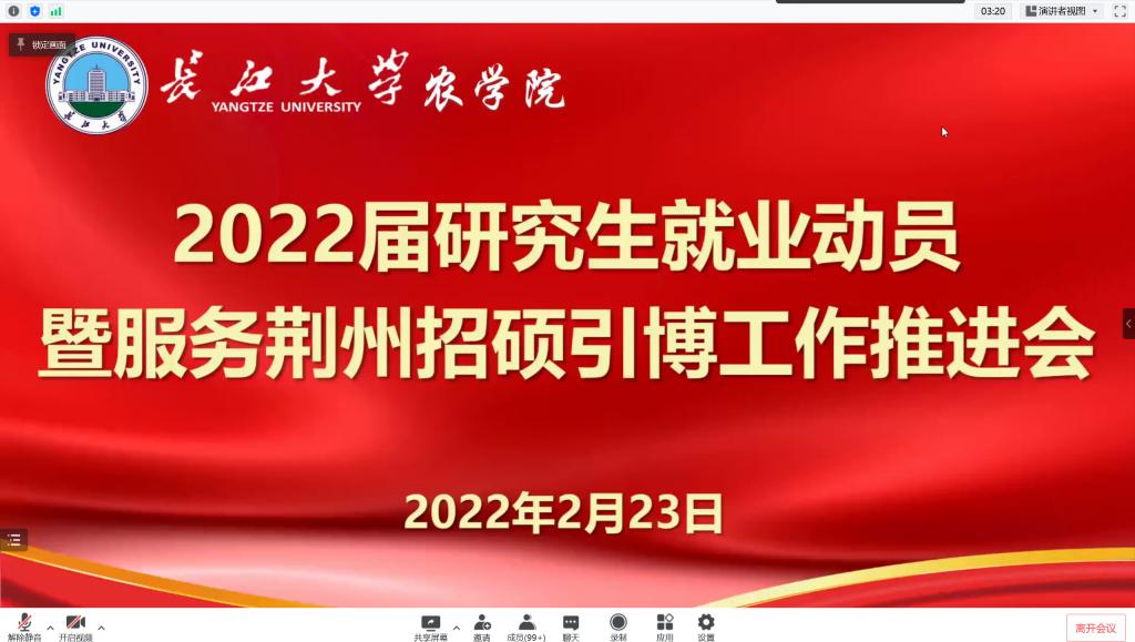 (通讯员 林香亮 陈龙艳)2月23日下午,M88官方网站召开2022届研究生就业动员暨服务荆州招硕引博工作推进会。副经理方正武、农学系书记王书平、植保系主任董小林、农资系书记陈小慧、就业专干刘庆、研究生辅导员林香亮、兼职辅导员张苗苗和全体2022届毕业研究生参会,党委副书记谭亮魁主持会议。