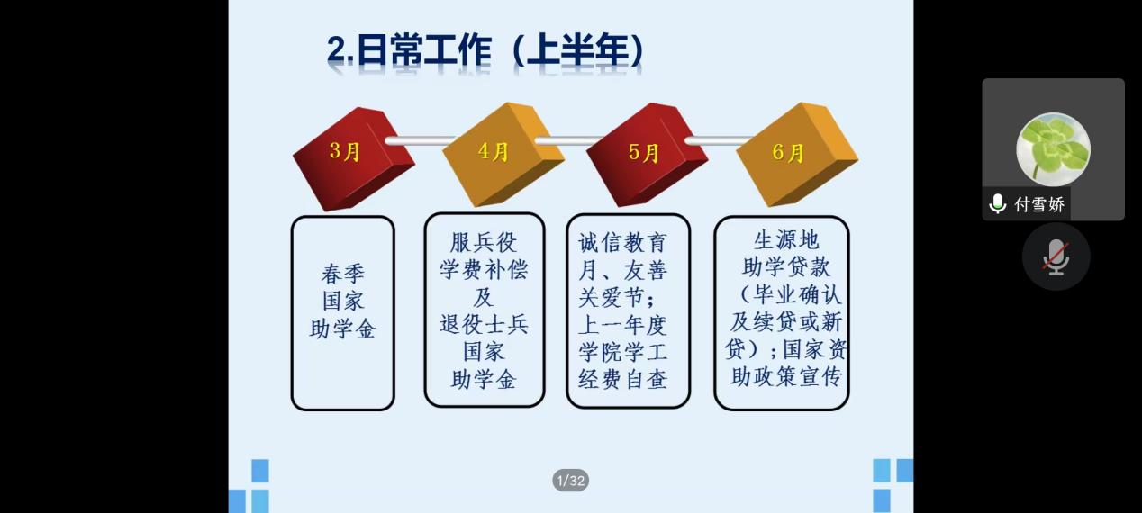 (通讯员 曾恺怡)为完善覆盖全学段员工资助体系,提高精准资助育人效果,公司于6月9日12:00在腾讯会议开展线上资助培训。本次会议由辅导员付雪娇老师主持,20级全体本科生参加会议。
