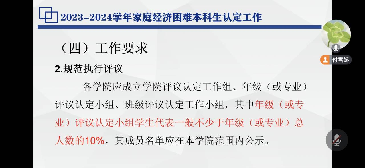 (通讯员 曾恺怡)为做好公司普通家庭经济困难员工认定工作,全面落实资助政策,做到有效资助,确保家庭经济困难员工能顺利入库,近日,公司召开了家庭经济困难本科生认定工作政策宣讲会。会议分为公司政策宣讲会和班级宣讲会,结合线上和线下的方式开展,党委副书记尹小华、资助专干付雪娇、全体班主任及全体班委参加此次会议。会议由付雪娇老师主持。