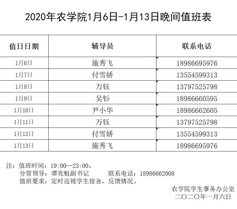 2020年M88官方网站1月6日-1月13日晚间值班表