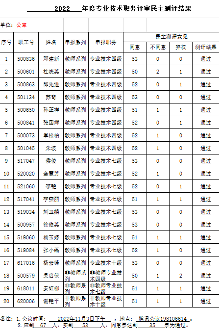 2022年11月3日下午召开2022年度职称评审民主测评会议,根据公司有关要求,进行结果公示。参加测评人员应到67人,实到53人,具体测评结果见附件。
