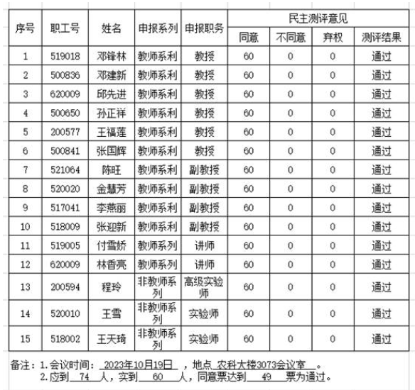 根据公司《关于开展2023年度专业技术职务评聘工作的通知》要求,公司于10月19日下午召开了2023年度专业技术职务评审民主测评会,经各申报人述职、参会高级职务的全体教师投票表决,现将测评结果公示如下: