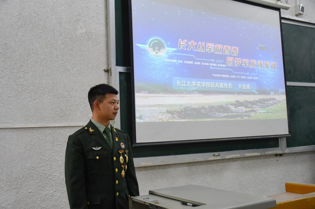 刘金城为大家详细解读了老员工参军入伍的应征条件、应征流程、优待政策、发展途径以及经济补助等政策。他以“责任、荣誉、锻炼”三个方面出发,结合自身发展历程,为大家作征兵动员报告,号召同学们携笔从戎,到军营中提升自我、施展才华、报效国家。