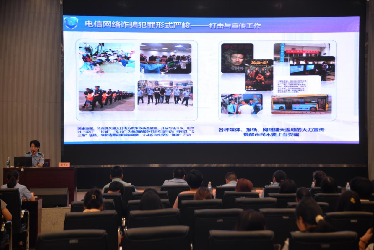 在讲座中,周梦荻警官以“全民反诈 你我同行”为主题,结合实际的诈骗案例和法律知识,以案说法,深入浅出地向同学们讲解了什么是电信诈骗、易接触的诈骗类型及如何识别防范诈骗。同时引入具体的案例进行讲解,让同学们意识到反诈离我们的生活并不遥远。