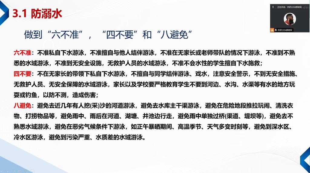 班会上,班级主要围绕交通安全、人身财产安全、食品安全、宿舍用电安全、防诈骗、防溺水等方面进行强调,提醒同学们增强自我防范意识,确保个人及他人的安全。另外,各班级重点摸排了假期离校员工信息,确实掌握离校员工的动向;要求离校同学假期结束后要按时返校,全员参与返校晚点名活动,因事假等延迟返校的,要第一时间上报课题组负责人。