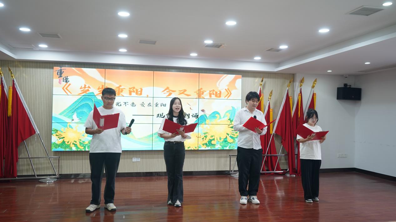 “谁说岁月催人老,青春的活力,依然在歌声中张扬”。在激昂的话语中,四位同学朗诵的现代诗《岁岁重阳,今又重阳》牵动了老人回忆的思绪。嘹亮的朗诵诉说着精神矍铄、老骥伏枥的人生态度。表演结束时,同学们为老人们献上祝福,场下掌声不断。