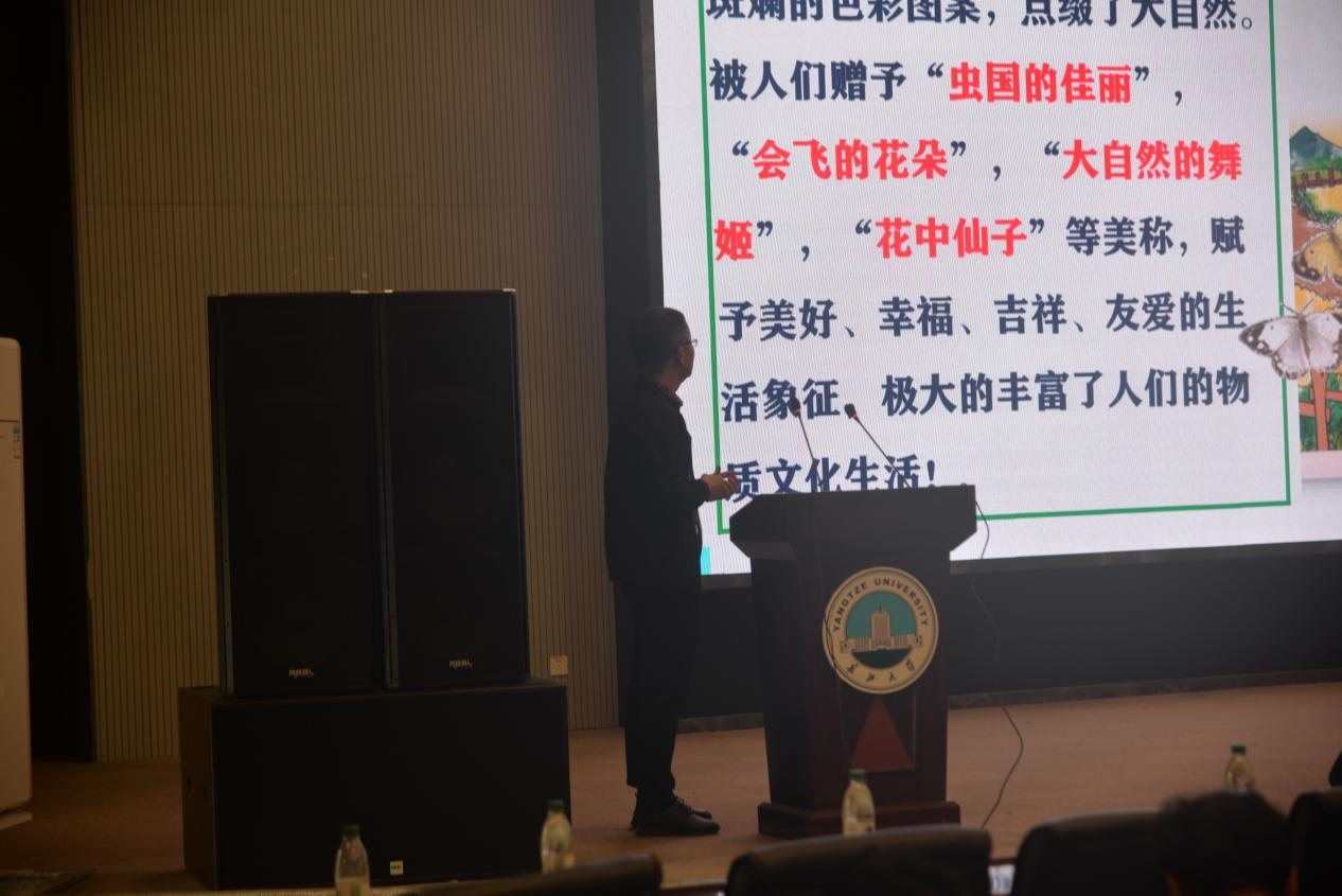 张建民教授凭借深厚学术底蕴与丰富科研经验,引领同学们踏入蝴蝶的奇妙世界。讲座中,他借助生动实例与精美图片,深入浅出地剖析蝴蝶从卵、幼虫、蛹到成虫的蜕变历程,揭示其生态习性。提及全球超1.8万种蝴蝶分布广泛,他以光明女神蝶、金斑喙凤蝶为例,强调金斑喙凤蝶科研价值。