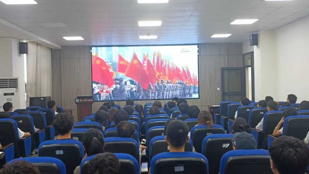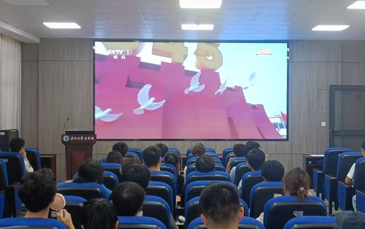 屏幕中,旌旗飘扬,钟声回荡;会场内,师生凝神,心潮共涌。随着庄严的国歌声响起,全体师生自发肃立,目光中满是敬畏与追思。一幅幅历史画面掠过,一段段抗战故事回响,大家仿佛穿越时空,感受到那段烽火连天中中华儿女的不屈脊梁。