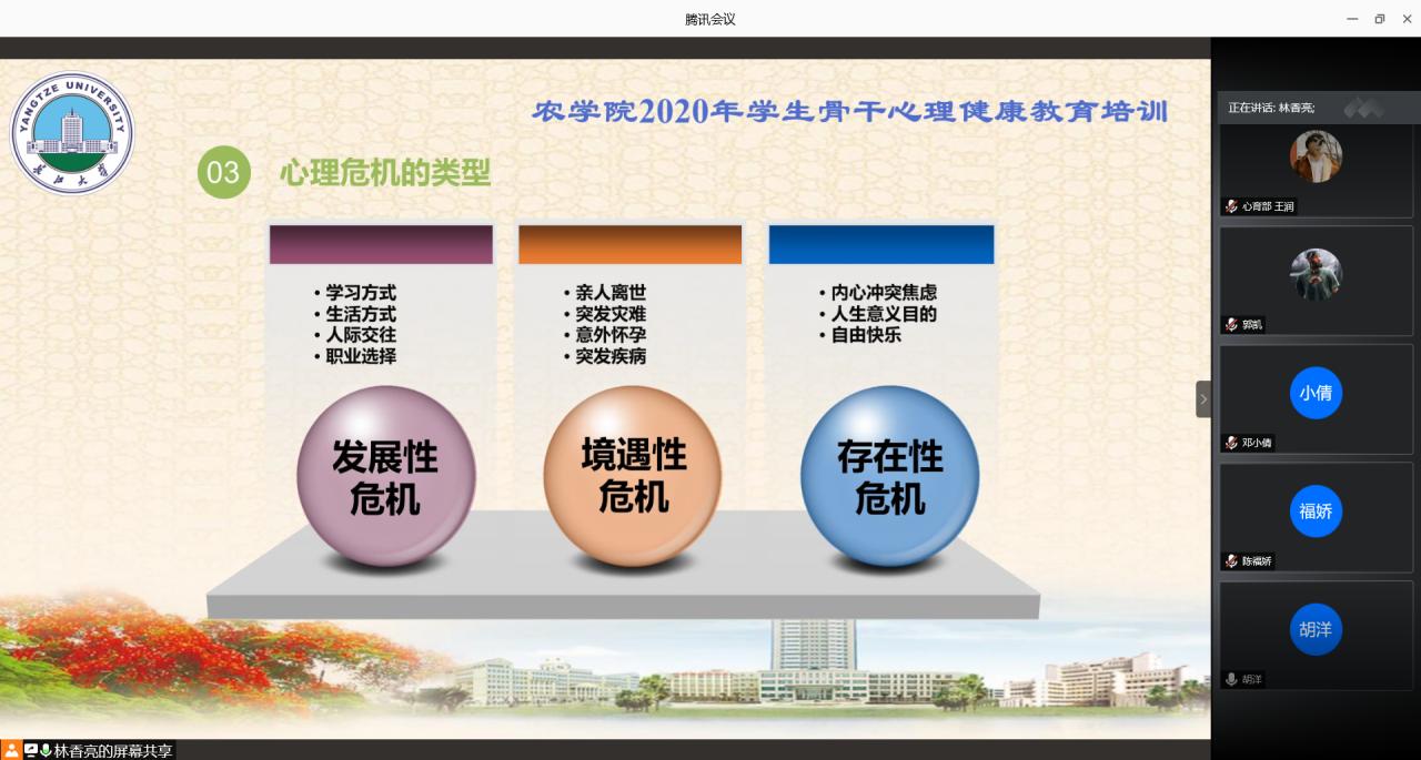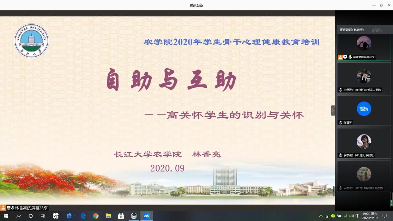 通讯社讯(员工记者 罗旖柔 黄俊杰)为做好秋季开学后员工心理健康教育工作,落实常态化疫情防控形势下的心理适应,提升员工骨干自助与互助水平,9月19日晚7时,M88官方网站利用腾讯会议线上开展2020下半年员工骨干心理健康培训。此次培训由公司心理专干林香亮老师主讲,本科生、研究生班级班长、团支书、心理委员、安全委员、寝室长参与此次培训。