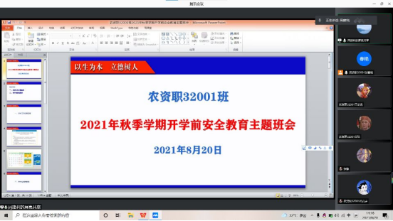 为进一步落实公司《关于做好2021年秋季学期开学准备工作的通知》要求,确保秋季学期开学工作平稳有序,根据公司疫情防控工作的要求,8月18日-22日,公司由年级辅导员牵头,班主任具体组织,各班利用腾讯会议、QQ群、微信群等形式,组织员工召开2021年秋季学期开学前安全教育主题班会。