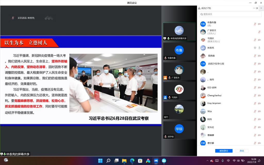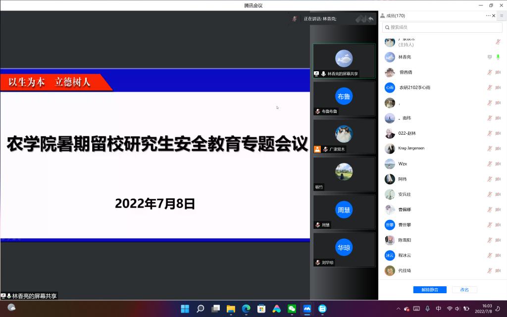 会上,研究生辅导员林香亮介绍了暑期留校研究生的基本情况。结合国内最新疫情防控形势和《新型冠状病毒肺炎防控方案(第九版)》,传达了公司关于暑期研究生安全教育管理工作的相关要求,研究生要按照“非必要不留校,非批准不返校”原则进行管理。林香亮提醒研究生暑期务必要注意防反诈、防溺水、疫情防控、食宿、交通等方面安全,时刻牢记安全第一。