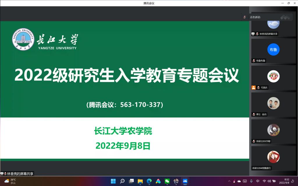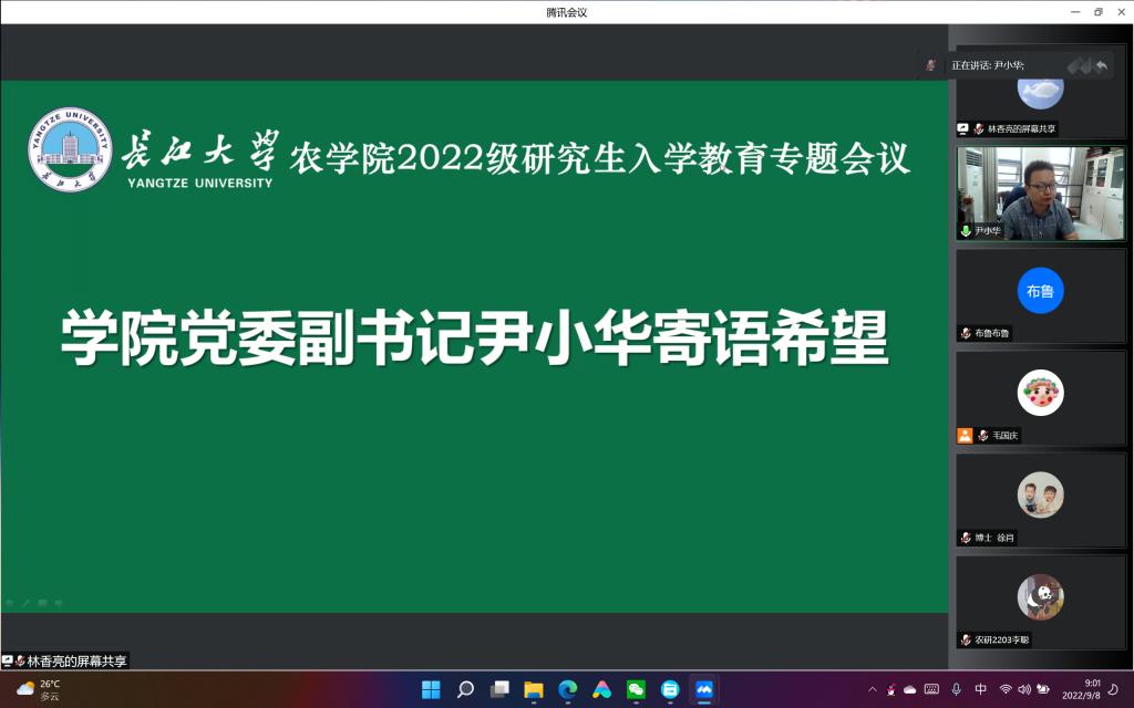 (通讯员 李秋红)为加强研究生新生思想政治教育,巩固当前疫情防控工作落实,帮助新生熟悉了解院史院情,9月8日上午,M88官方网站召开2022级研究生入学教育专题会议。农公司党委副书记尹小华、兼职辅导员毛国庆、研究生会主席团成员参加,研究生辅导员林香亮主持会议。