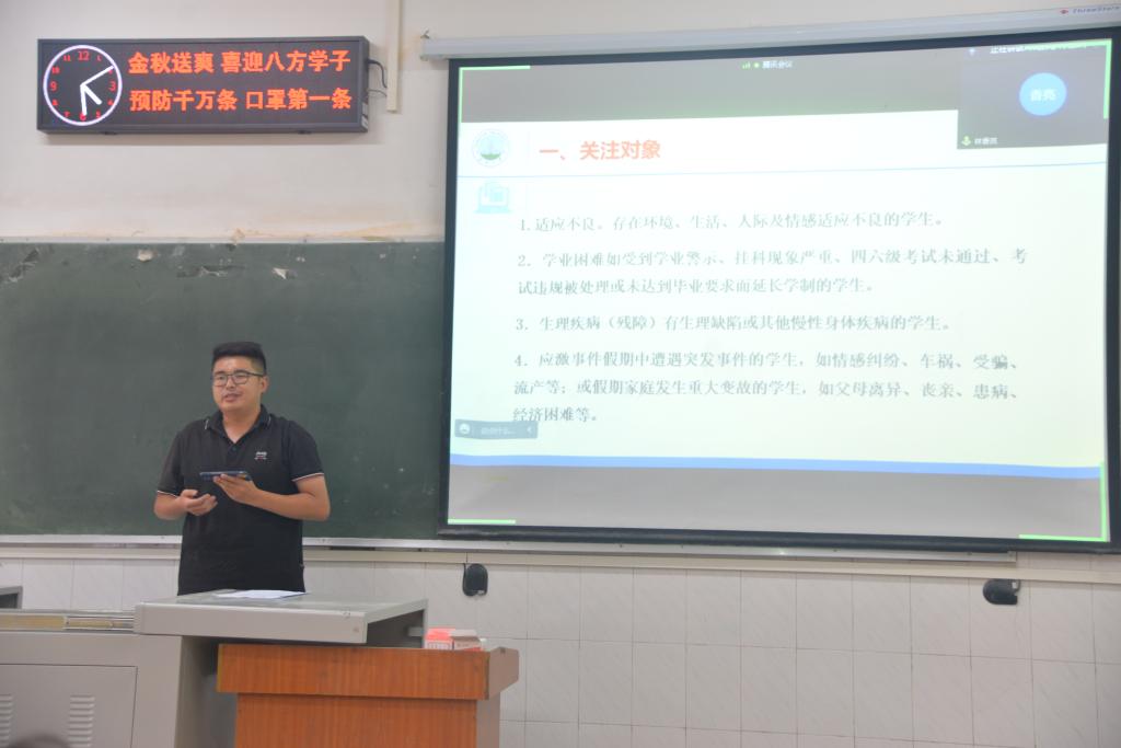 林香亮老师主要介绍了员工的心理健康安全问题和种子画、心理健康建设月等特色活动。在日常生活中员工干部和同学们生活在一起,更能第一时间发现同学遇到的困难,林老师强调员工干部一定要有关心同学的意识,遇到情况要第一时间上报老师,老师会采取最正确的方式应对。“希望员工干部平时能全力为辅导员分忧,一起守护M88官方网站员工的心理健康。”林老师对参会人员提出要求。