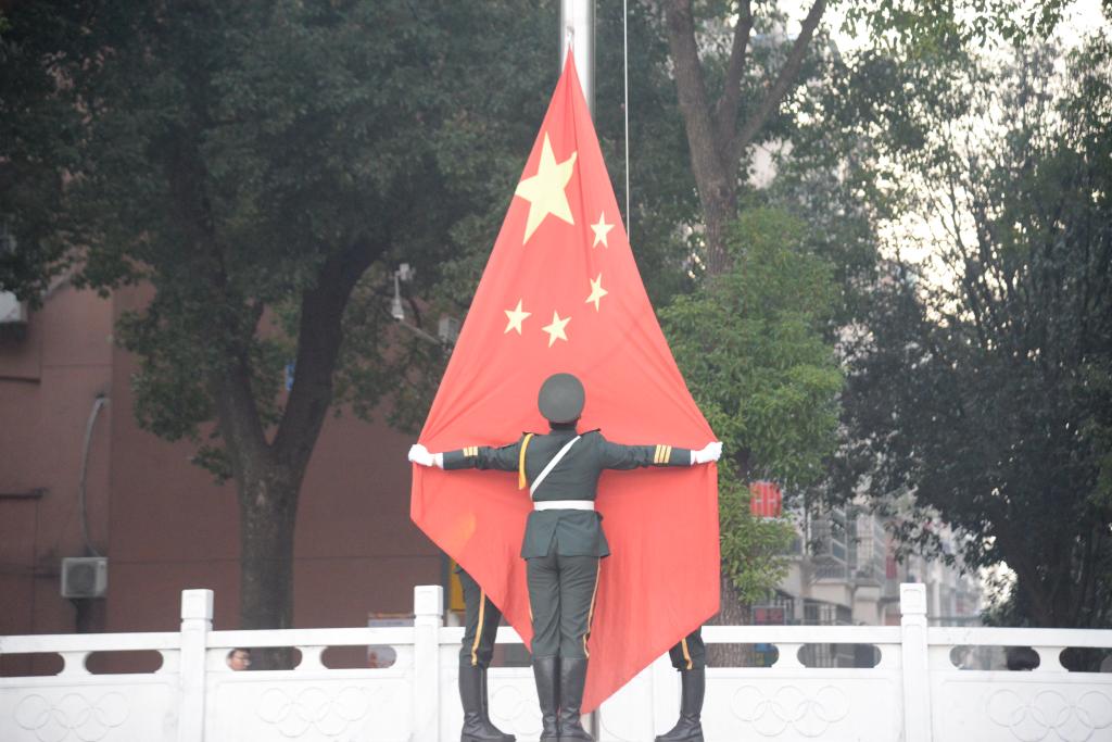 升国旗仪式正式开始。伴随着庄严的《义勇军进行曲》,国旗护卫队队员迈着铿锵有力的步伐,操场上空,一面鲜艳的五星红旗冉冉升起。全体师生庄严肃立,行注目礼,心怀对祖国的无限热爱之情。