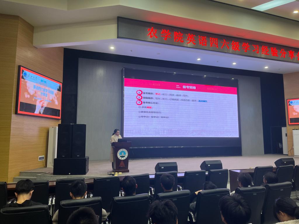 (见习记者 赵雨洁/文 向建华/摄)为加强学风建设,帮助员工认真备考英语四、六级,提供高效英语学习方法,提升四、六级考试的应试技巧,公司于3月20日19:00在农科大楼1058报告厅开展了英语四、六级学习经验分享会。此次经验会的主讲人为辅导员唐玉婷,大一全体新生参与此次会议。