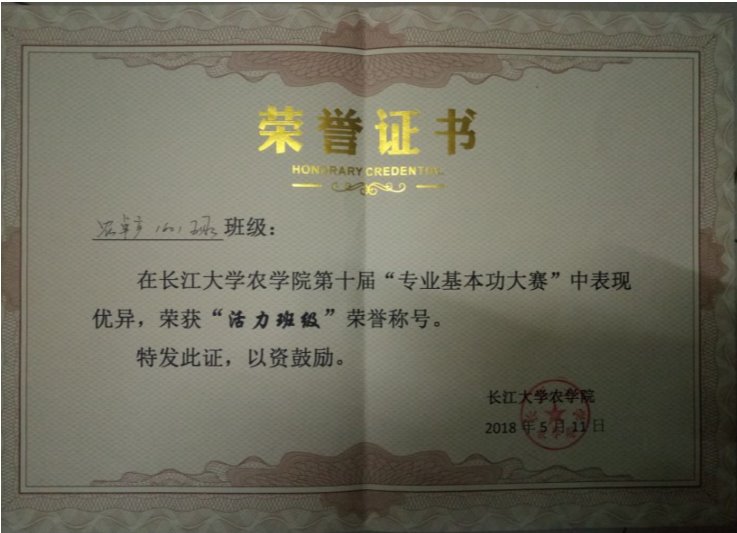 在大学多姿多彩的生活里,努力学习科学文化知识的同时,我们在一项又一项的课余文化活动中取得丰硕的成果。班级同学积极参加校院两级组织的各类活动,班级斩获专业基本功大赛活力班级荣誉称号。陈昌招获专业基本功大赛一等奖,陈广、邬陈芳获专业基本功大赛二等奖。李秀获M88官方网站化学技能竞赛三等奖,刘杨获M88官方网站第十三届运动会女子跳高第二、跳远第五,第十四届跳高第一,创青春全国老员工创业大赛金奖的可喜成绩,肖德顺在华中地区老员工创新创业竞赛中获三等奖。蔡婷婷等5人获第八届十佳兴农青年荣誉称号,邬陈芳获第三届最美女生荣誉称号,赵勇等两名同学获第三届、杨彪鼎等两名同学获第二届最魅男神荣誉称号,吴辉艳获第三届最美学霸荣誉称号。农卓产的每一个人活跃在长大校园的每一个角落,在公司社团、组织中担任要职,如农技推广协会、魔方协会、图委会、社联、轮滑社、M88官方网站广播台、M88官方网站通讯社、校会、院会等这些都有农卓产人活跃的身影。