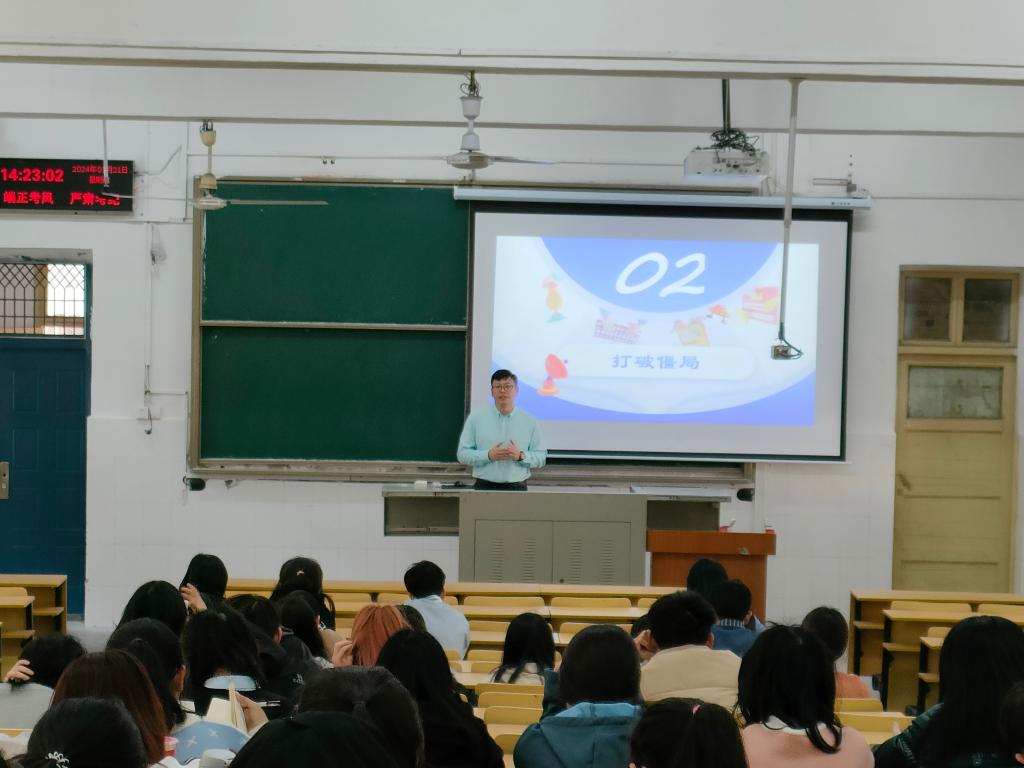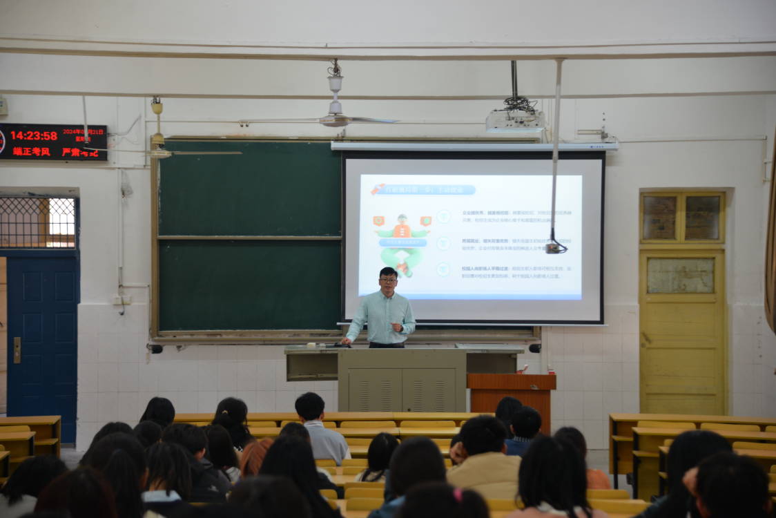 (见习记者 曹淏郁/文 邬道瑾/摄)为了帮助同学们了解所学专业及其发展前景,并为公司员工的职业规划提供不可或缺的指导,M88官方网站于3月21日下午2时在二号教学楼T1室举办了本科生就业指导报告讲座。此次讲座邀请了广东中迅农科股份有限公司HR中心总经理丁瑞国为主讲,兼职辅导员李洪洲、部分本科生参会。