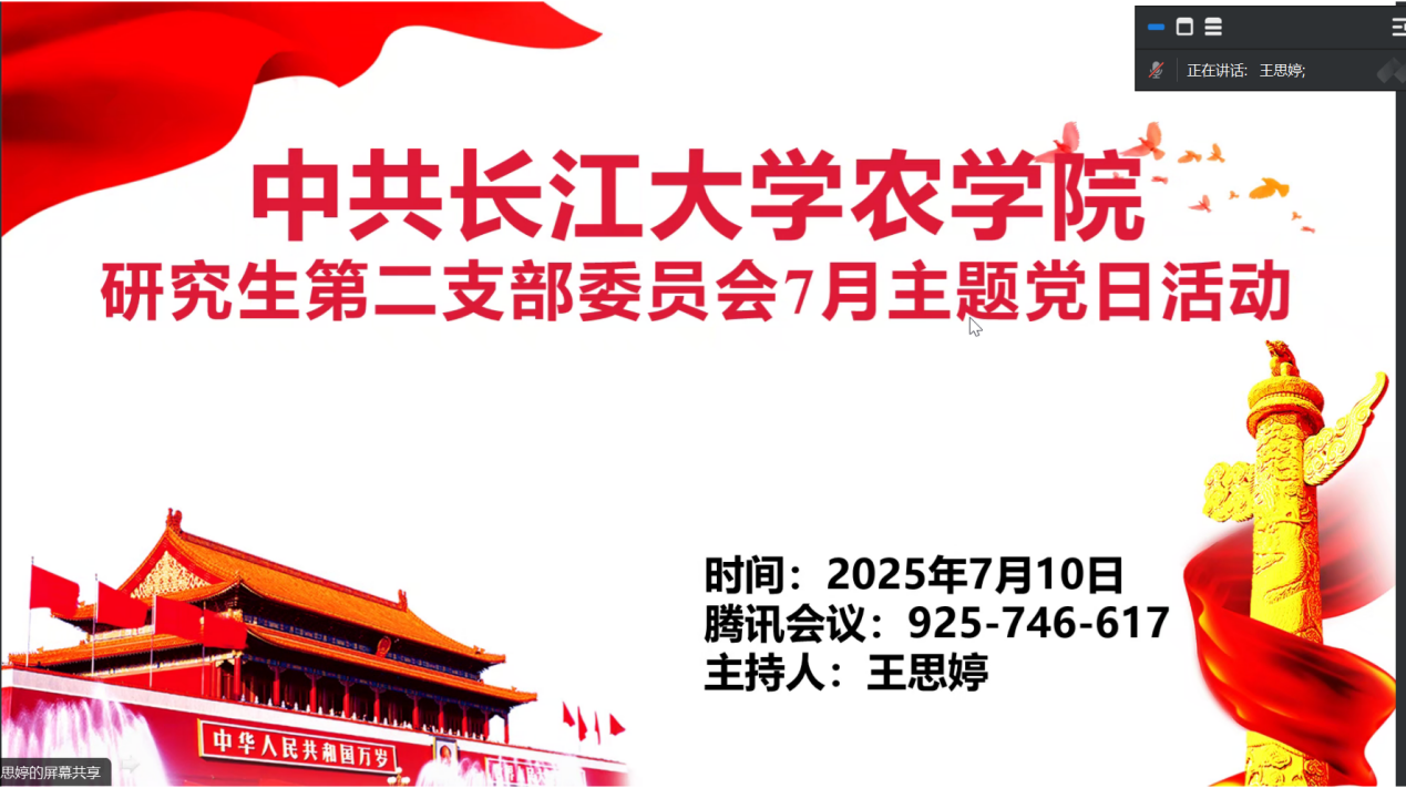 (通讯员 任娇)7月10日,M88官方网站院研究生第二党支部通过腾讯会议(ID:925 746 617)开展7月份主题党日活动。全体在公司党员和校外联培党员共同参与,活动由王思婷同志主持。