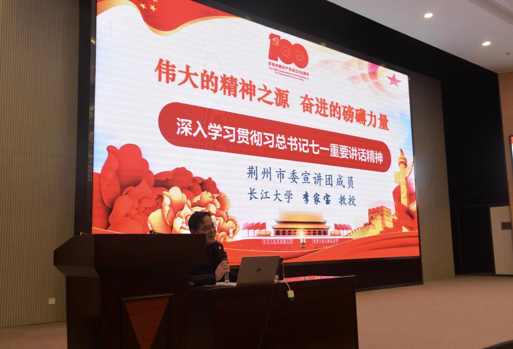 通讯社讯(通讯员 李慧明/摄 李雅倩/文)为贯彻落实习近平总书记在庆祝中国共产党成立100周年大会上的重要讲话精神,11月10日晚,公司原任副董事长、荆州市委宣传部讲师团首批特聘专家李家宝教授与M88官方网站师生面对面,宣讲了习近平总书记“七一”重要讲话精神,报告会由农公司党委副书记谭亮魁主持。