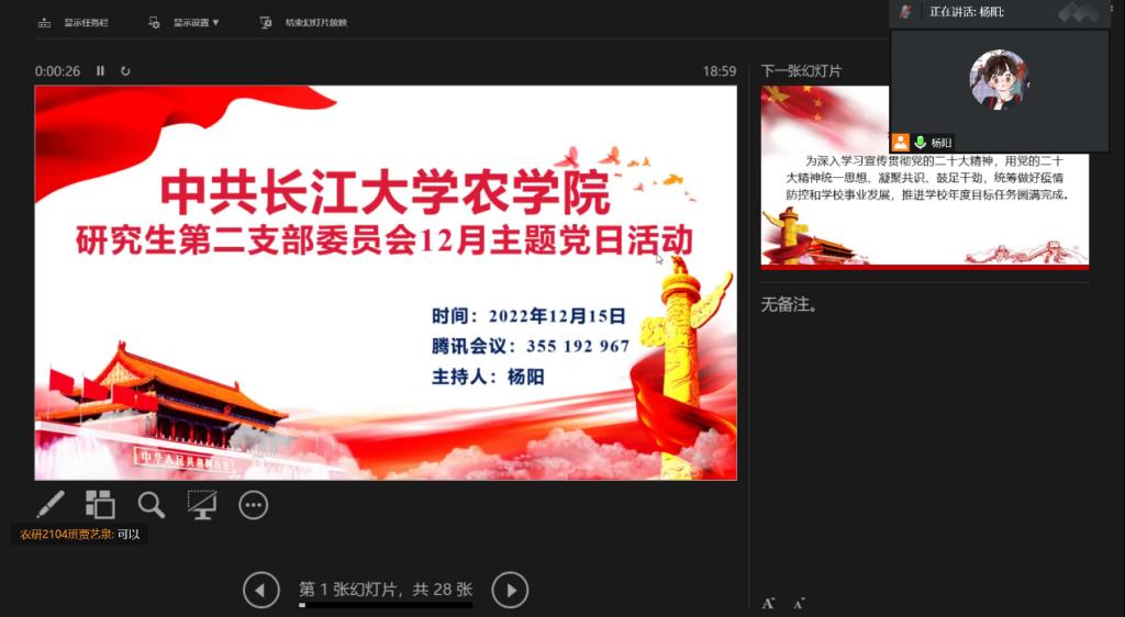 (通讯员 曹佩娜 宋梦圆)12月15日晚上7点,公司研究生第二党支部以腾讯会议(ID:355192967)的方式在线上召开十二月份主题党日活动。全体在公司党员和校外联培党员参与此次活动,活动由支部副书记杨阳同志主持。