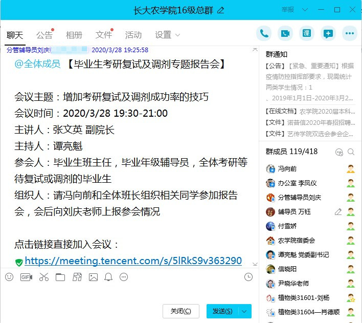 通讯社讯(通讯员 刘庆)为了提升毕业生考研复试与调剂成功率,3月28日19:30,M88官方网站利用“腾讯会议”平台,特邀分管教学副经理张文英与110名考研毕业生进行线上交流,为毕业生的考研复试与调剂指点迷津,毕业生班主任、年级辅导员参加报告会。报告会由党委副书记谭亮魁主持。