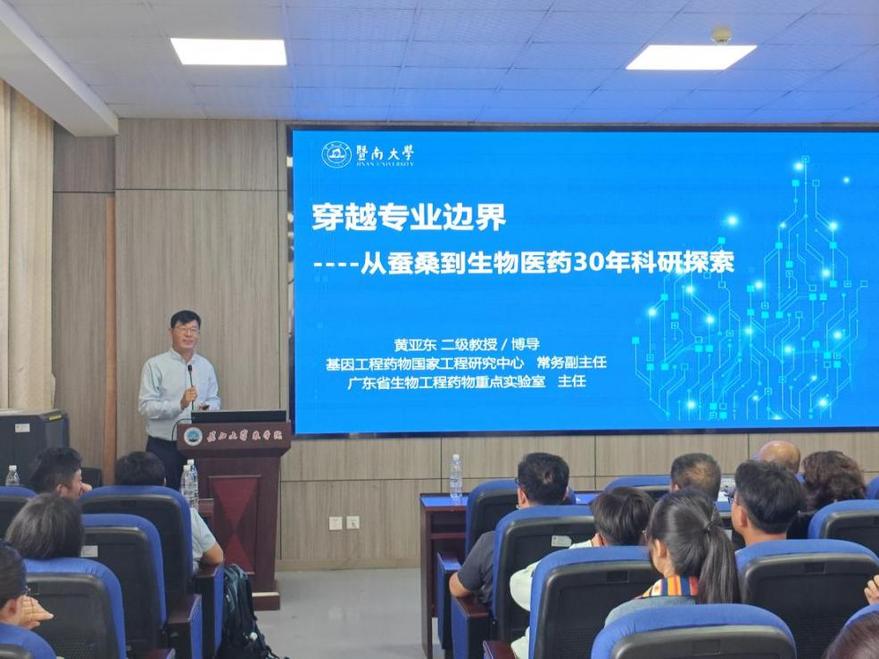 经过短暂休息后,员工黄亚东,暨南大学二级教授,博士生导师,以《穿越专业边界——从蚕桑到生物医药的探索》为题,以蚕桑生物技术为起点,讲述从传统蚕桑领域向生物医药领域跨界的历程。分析基因工程与合成生物学技术在药用蛋白开发中的核心作用,阐述如何通过技术创新克服基因工程药物表达量低、半衰期短及大分子蛋白药物难以进入生物屏障等“瓶颈”问题。并以成纤维细胞生长因子和胶原蛋白为代表案例,揭示大分子蛋白在组织再生修复领域中的关键作用及其分子机制,展示相关产品的最新开发进展,为跨学科和专业的融合提供了新的思路。