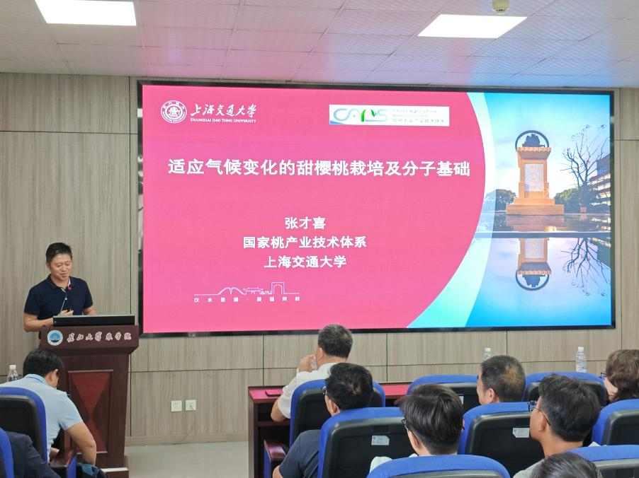紧接着,员工张才喜,上海交通大学教授,博士生导师,带来了题为《适应气候变化的甜樱桃栽培及分子基础》的报告。甜樱桃被称为“黄金种植业",主要在渤海湾等冷凉地区生产栽培。张才喜介绍了团队通过20年来的努力,成功通过栽培技术创新和低需冷量品种育种,实现”北樱南移", 将樱桃栽培南限向南推进了910余公里的案例。这为我国樱桃的早熟栽培和周年生产奠定了坚实的基础。