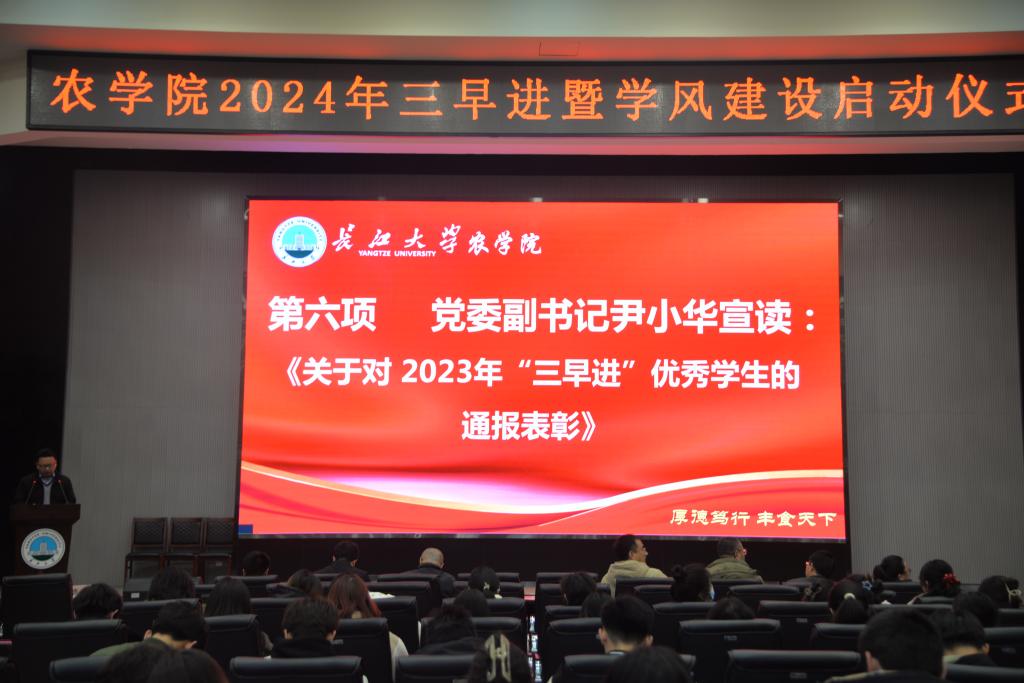 仪式伊始,由23级员工代表马新玉及22级员工代表王华鉴发言,他们认为:“三早进”源于理论,行于实践。他们鼓励全体同学求真学问,练真本领,在“三早进”中找到适合自己的课题组,并从实践中来,到实践中去。随后,课题组组长代表杨伟表示,“三早进”能激发同学们的科研热情,实现同学们“农学不只是耕耘”的职业目标。农学系主任邓锋林强调,在“三早进”中,全体员工应树立目标、知行合一、勤于动手、善于动脑。接着,为表扬先进,树立榜样,党委副书记尹小华宣读颁奖文件,对在“三早进”课题活动中表现突出的员工予以鼓励。